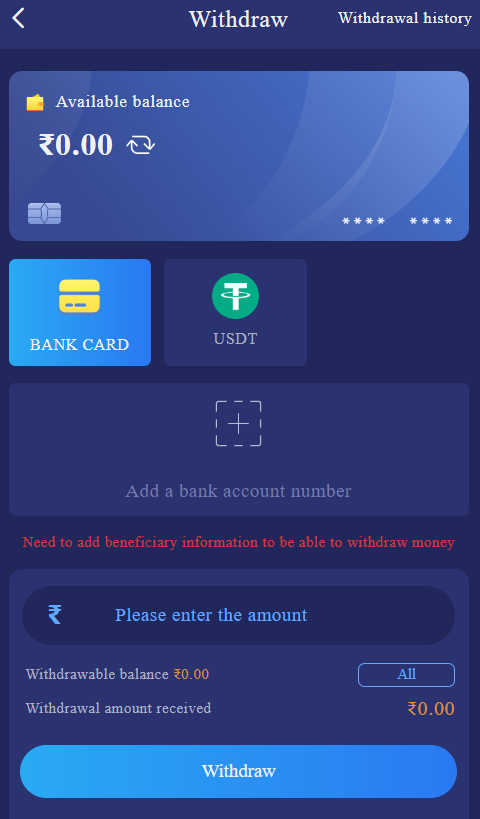 - Crypto Deposits – Users who prefer cryptocurrency can deposit using USDT and other accepted digital currencies.